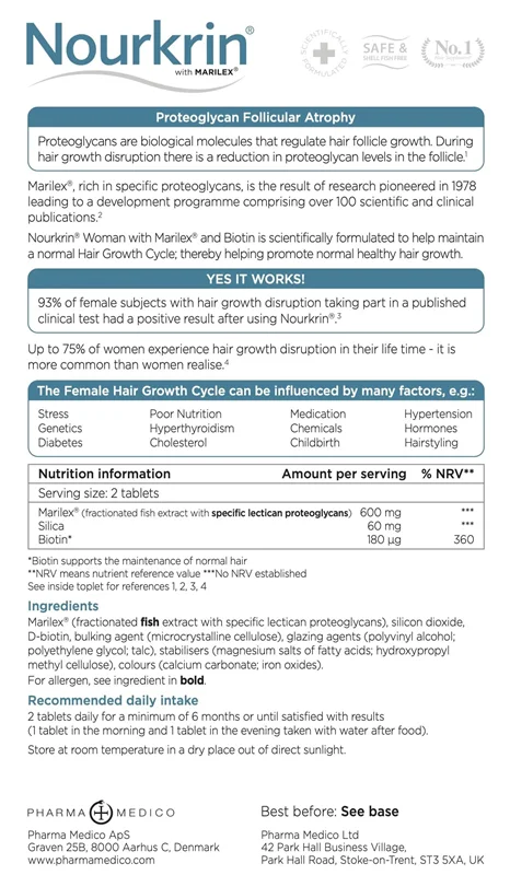 - ماریلکس: هر وعده مکمل نورکرین بانوان (2 عدد کپسول) حاوی 600 میلی گرم ماریلکس است که نوعی پروتئوگلیکان دریایی اختصاصی است و ماده اصلی فعال در نورکرین بانوان است و نقش مهمی در تقویت فولیکولهای موی بانوان دارد.