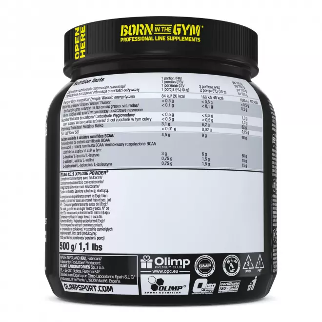 حاوی 4.5 گرم بی سی ای ای حاوی 3.1 گرم پروتئین حاوی 3 گرم لوسین حاوی 0,75 گرم والین حاوی 0,75 گرم ال ایزولوسین حاوی 20 کیلو کالری انرژی نسبت 4 به 1 به 1 ال لوسین، ال والین و ال ایزولوسین100 سروینگ500 گرم