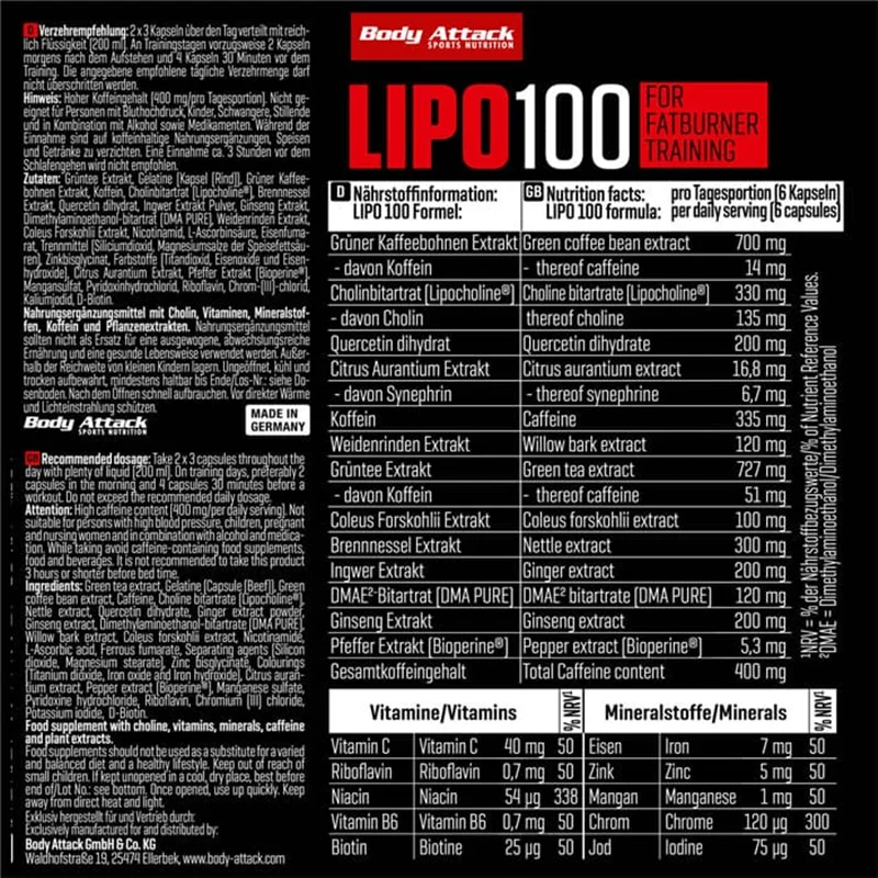 چربی سوزی لیپو 100 بادی اتک BODY ATTACK LIPO 100 پشتیبانی بهینه را برای تمرین چربی سوز شما فراهم می کند. این کپسول ها حاوی مواد قوی هستند که به شما کمک می کنند تا به اهداف خود برسید و تمرین های خود را فراموش نشدنی کنید. گوارانا، عصاره چای سبز، کافئین، کولین، روی و ویتامین های اضافه شده در هر کپسول به چربی سوزی شما کمک می کنند.